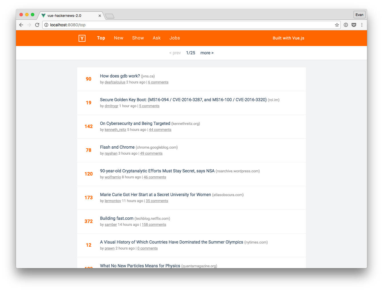 HackerNews 克隆是基于 HN 的官方 firebase API、Vue 2.0、Vue Router 和 Vuex 来构建的,使用服务器端渲染。